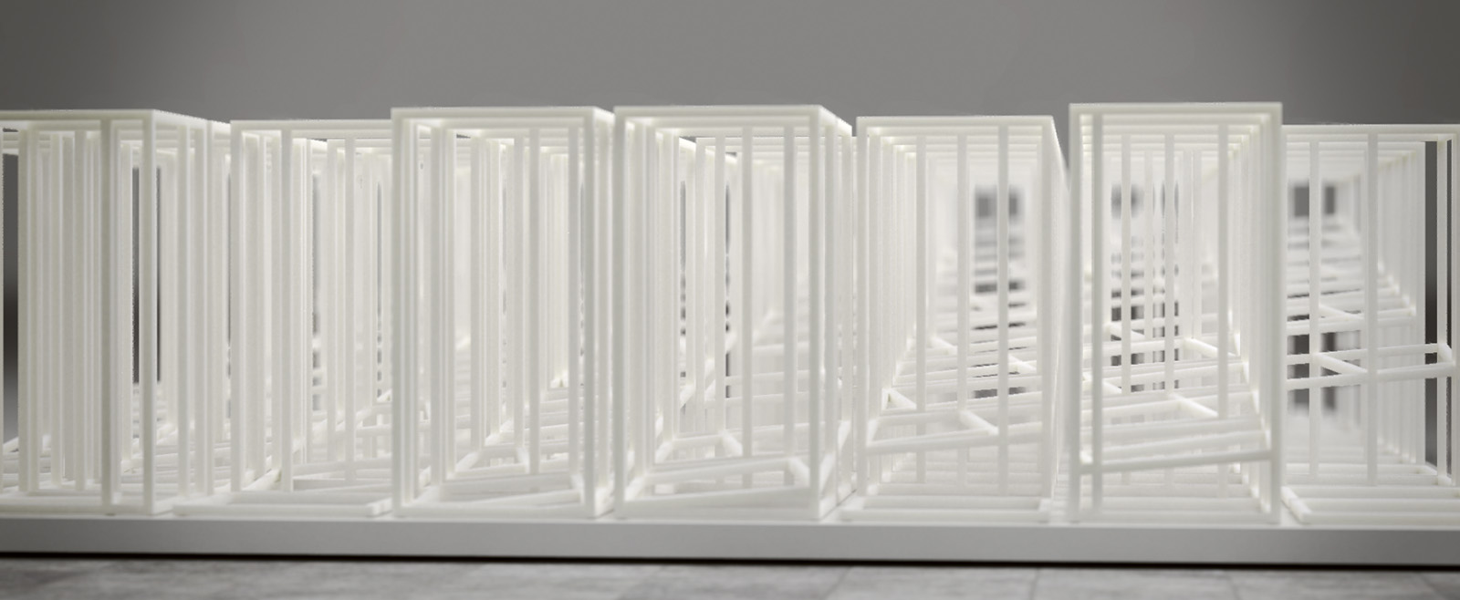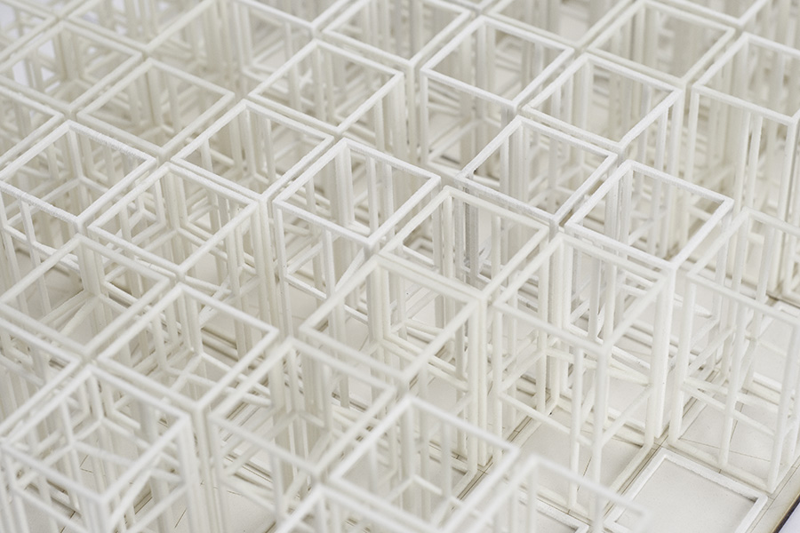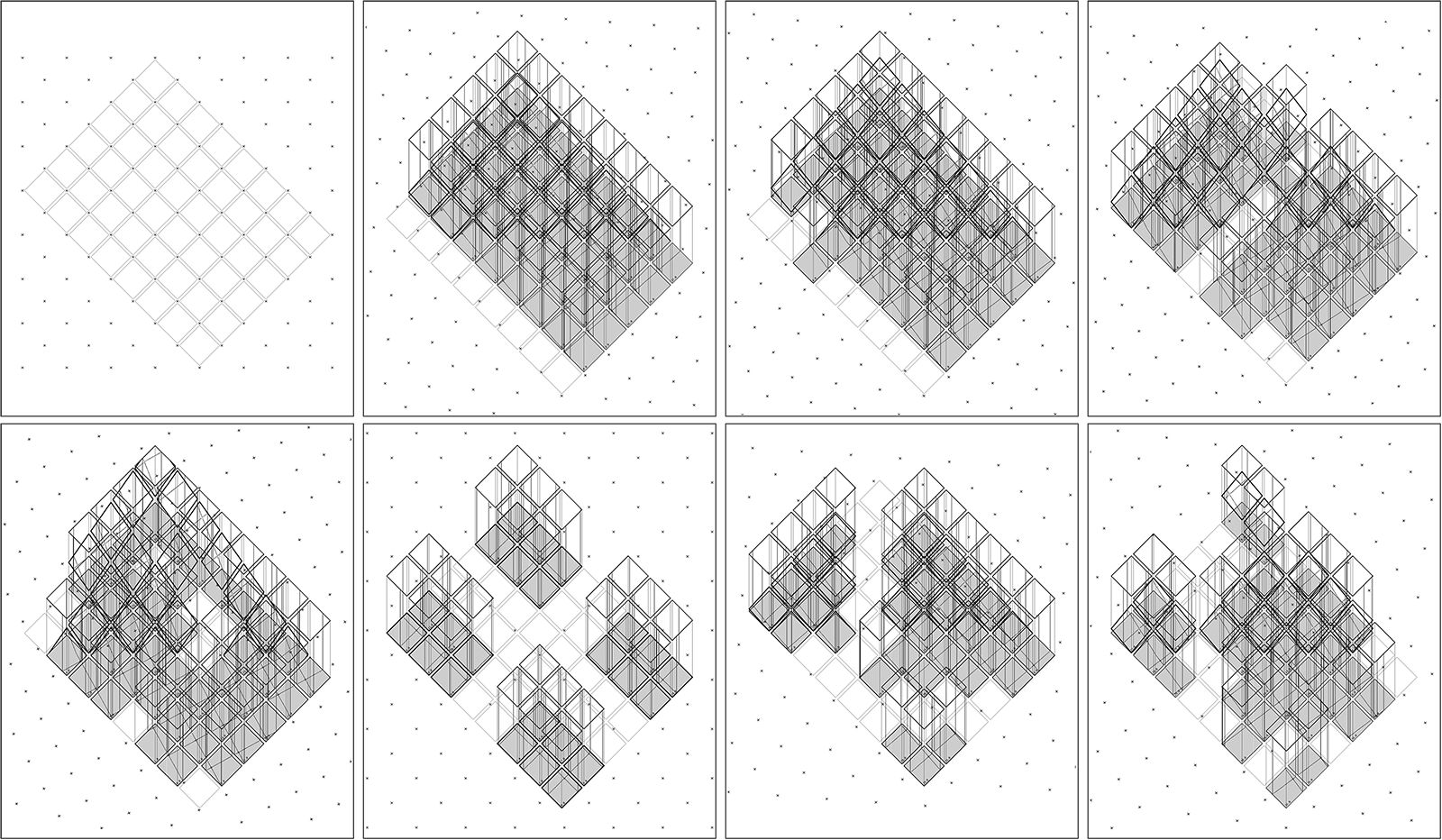 Two registrations, of even incrementation, are overlayed on top of each other. One manifests in the form of a point grid, while the other is a cellular grid. In transformation, one registration is rotated in relation to the other. Whereby a there is spatial coincidence of both grids, a three-dimensional cell is formed. Embedded in this emergent cell is a strut, whose orientation is dictated by that of the point grid. As this series involves the rotation of two similar rectangular grids, there will naturally emerge patterns of regularity at angle of 0, 45, and 90 degrees, while sets derived from intermediate angles will produce seemingly more chaotic patterns of emergence.