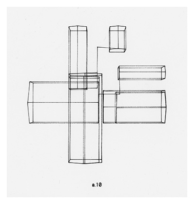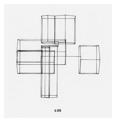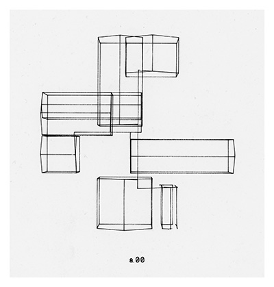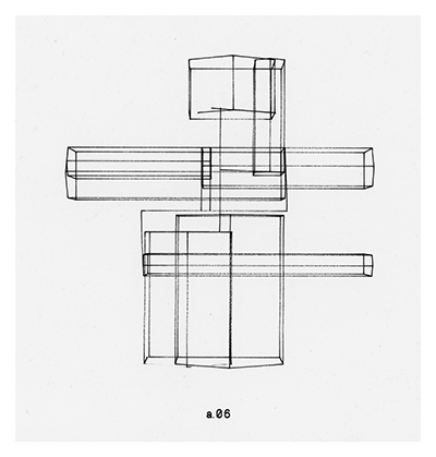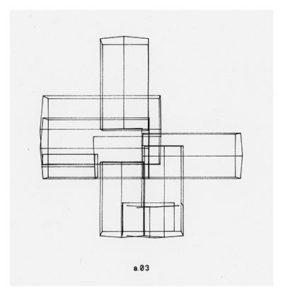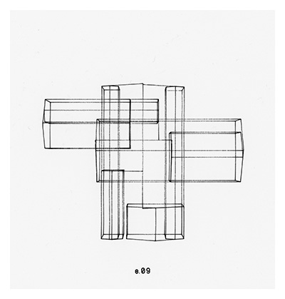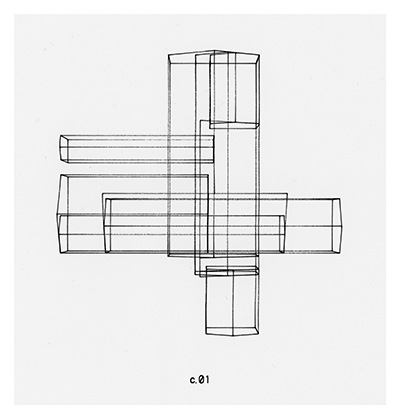 Randomized frames were generated from a basic extruded form, which was duplicated, and rotated 90 degrees. Through iterations of this process, the original figures become animated within their formal and generative boundaries. A Roland pen plotter was used to draw samples of the design as its plot process mimicked the conceptual accumulation of frame elements in code.