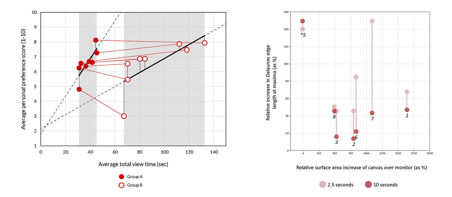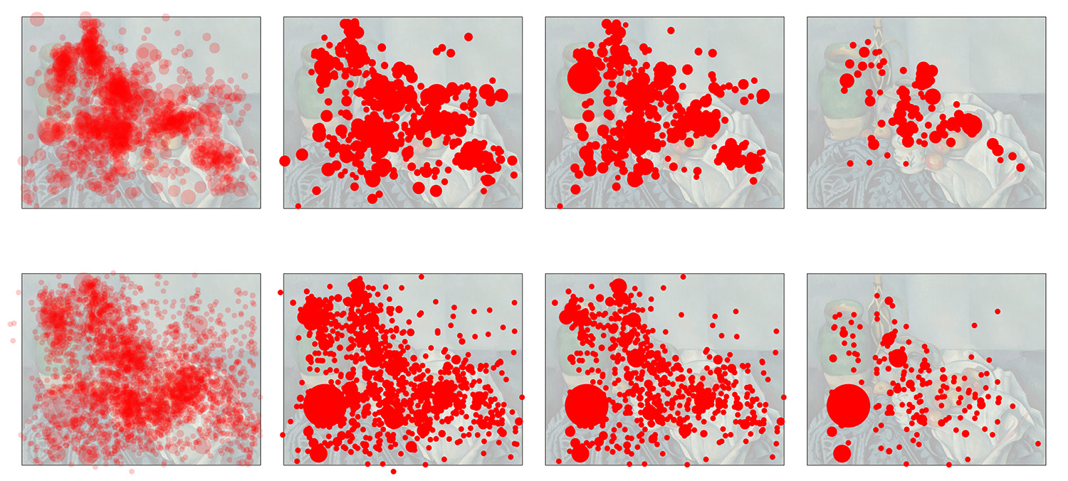 (Right) Correlation between surface area of viewed work (Gallery Group) and general distribution pattern of fixations.