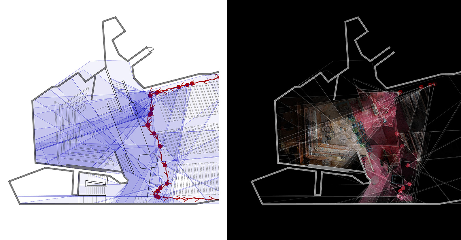 Side‐by‐side comparison of gaze‐informed plans, focusing on sanctuary stage and rear chapel. Variable point cloud density in relation to overlapping ’cones of vision.’
