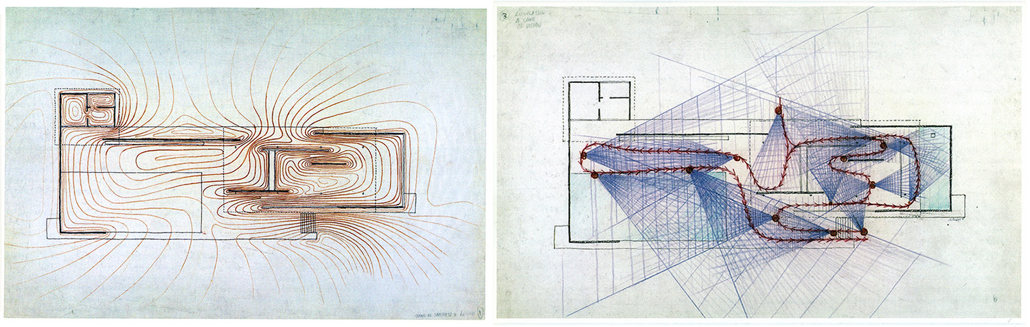 Two of Paul Rudolph’s original energy drawings, showing various phenomenal and extra‐phenomenal aspects of Ludwig Mies van der Rohe’s Barcelona Pavilion.