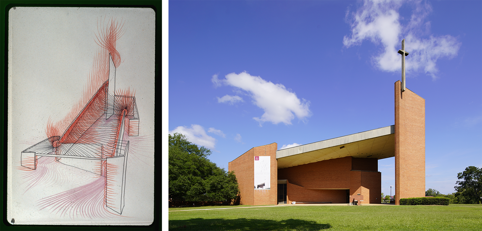 (Left) Rudolph's energy drawing of Tuskegee Chapel (Tuskegee, Alabama). (Right) Exterior of Tuskegee Chapel showing main entrance.